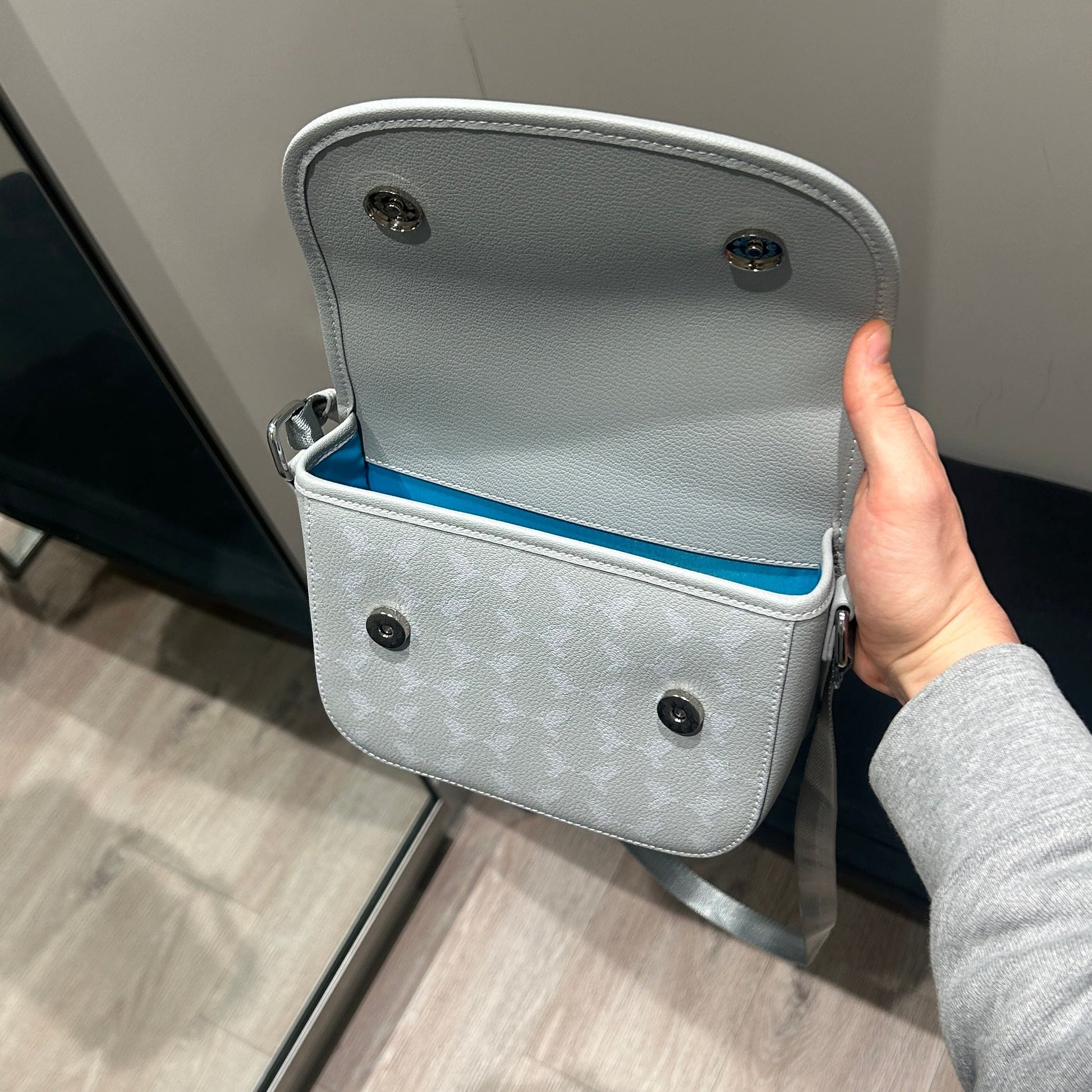 - Baby blue interior with 3 storage compartments